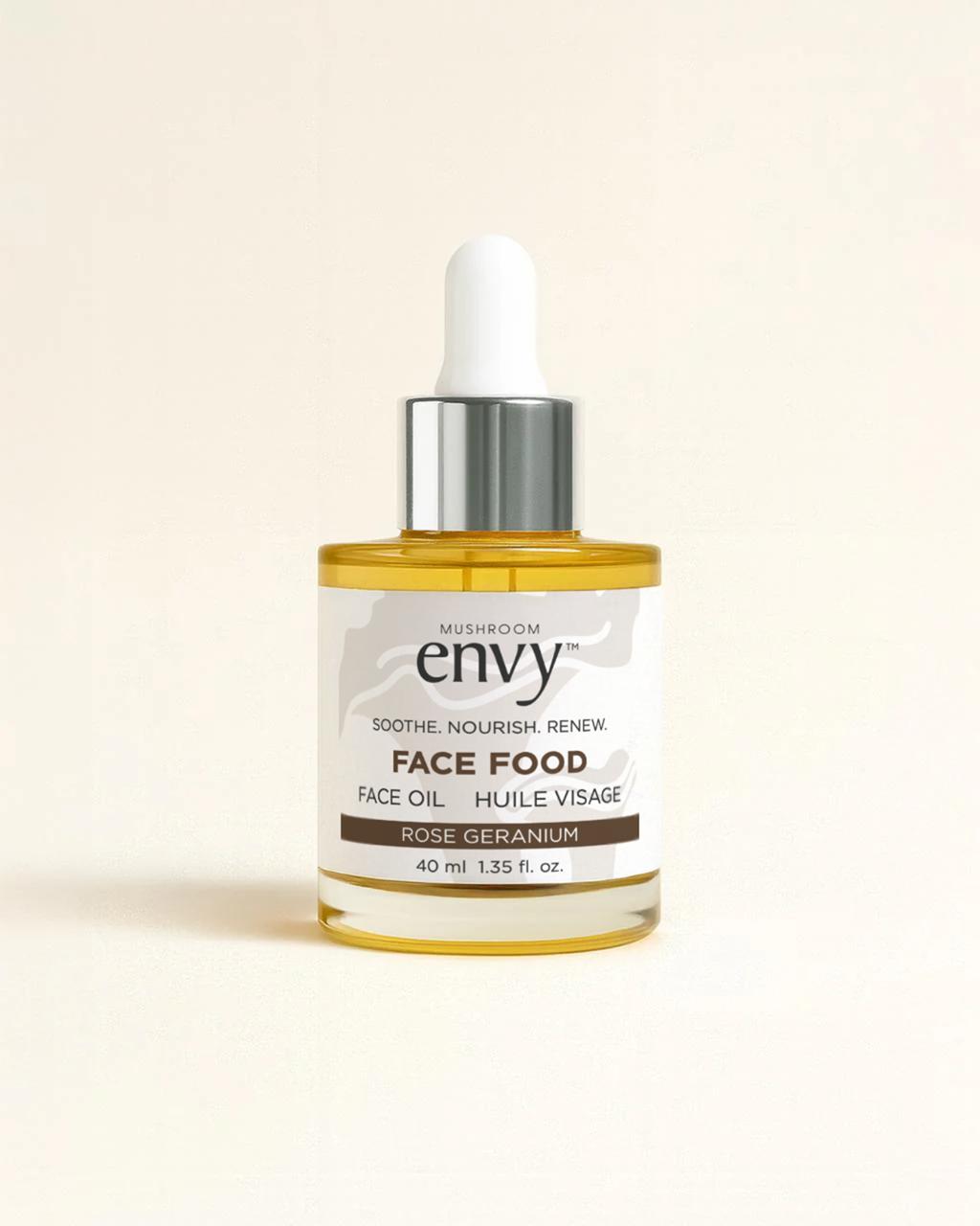 Face Food is now Organic! Face Food is a nutrient-dense powerhouse that nourishes, hydrates, and rejuvenates all skin types without leaving a greasy feel. This face oil can help reduce redness caused by dry, sensitive skin. This is a synergistic blend of Reishi and Shiitake mushrooms, along with natural botanicals such as Rosehip, Calendula, Cranberry, Sunflower, Jojoba, and Rose Geranium. Experience the benefits of healthier, softer, and radiant skin with Face Food.